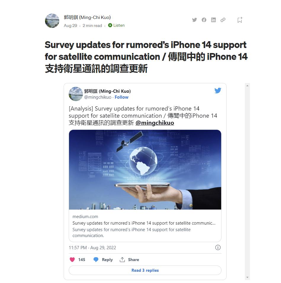早在去年,郭明錤就预测iPhone 13系列可能会支持卫星通信,然而最终该预言并未成真。彭博社记者马克·古尔曼(Mark Gurman)也曾对苹果的卫星通信功能将具备哪些功能进行了前瞻。