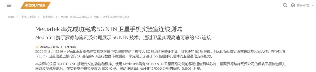 就在最近,作为全球出货量第一的手机芯片厂商 联发科,也宣布成功完成了全球首次5G NTN卫星手机实验室连线测试, 将智能手机接入了5G非地面网络(NTN),通过卫星实现了高速可靠的5G连接。