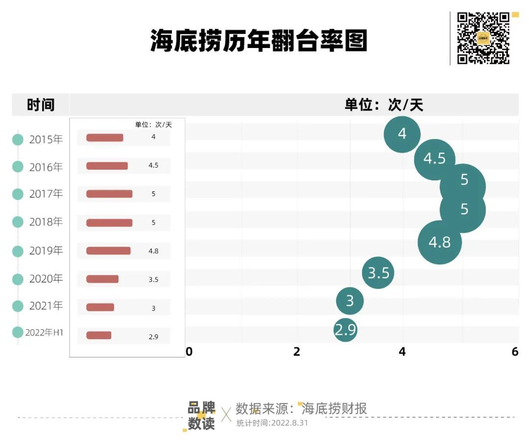 业界一直认为,啄木鸟计划会为海底捞的翻台率带来一定的积极影响。杨利娟也曾对媒体表示,近几个月海底捞整体的翻台率在逐月改善。 但从实际数据来看,海底捞今年上半年的翻台率为2.9次/天,较去年同期的3.0次/天有所下滑。