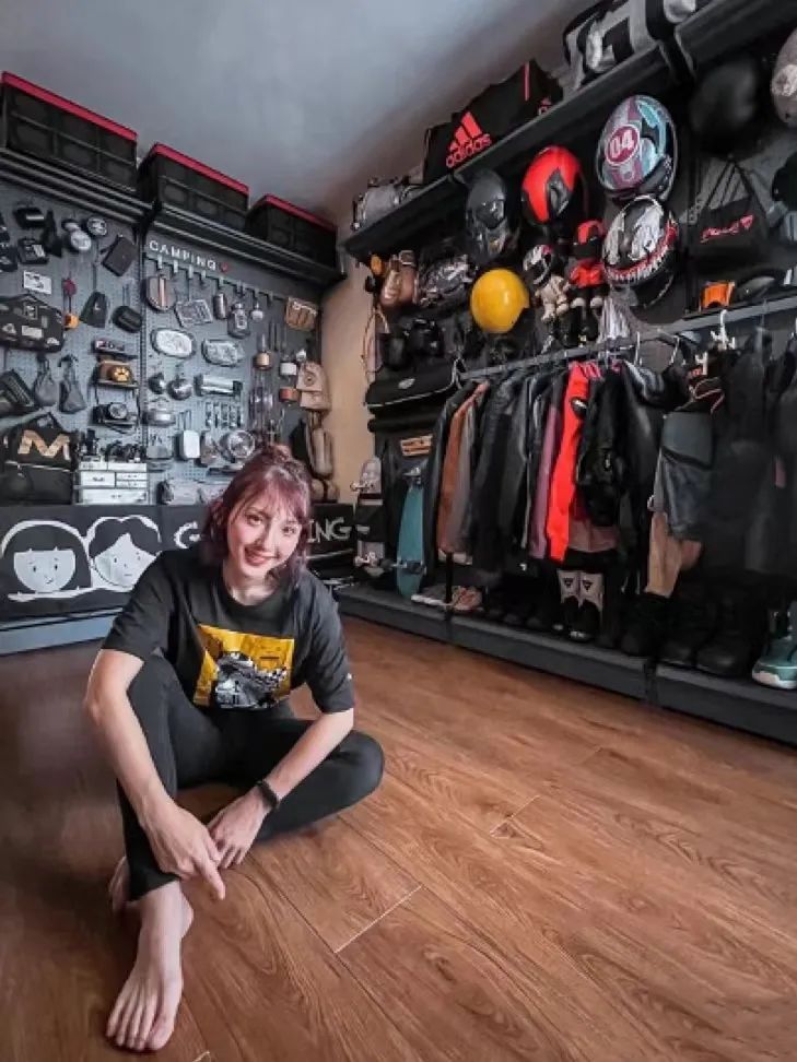 采访中,晓萌给「蓝洞商业」发来自己的装备间图片,露营、拳击、射箭、网球、滑板、攀岩、滑雪、骑行等运动装备组成了一间商店,摩托车头盔就有20个,「喜欢的东西我就愿意花钱,你让我花钱买包我可舍不得。」至于摩托车,林林有一辆宝马750、杜卡迪939和一辆踏板摩托车,之前她还换过6辆摩托车。
