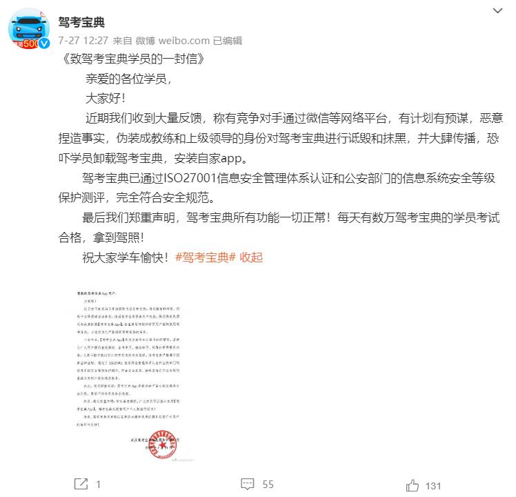 随后,驾考宝典官方微博对此发布声明表示,近期收到大量反馈,称有竞争对手通过微信等网络平台,有计划有预谋,恶意捏造事实,伪装成教练和上级领导的身份对驾考宝典进行诋毁和抹黑,并大肆传播,恐吓学员卸载驾考宝典,安装自家APP。