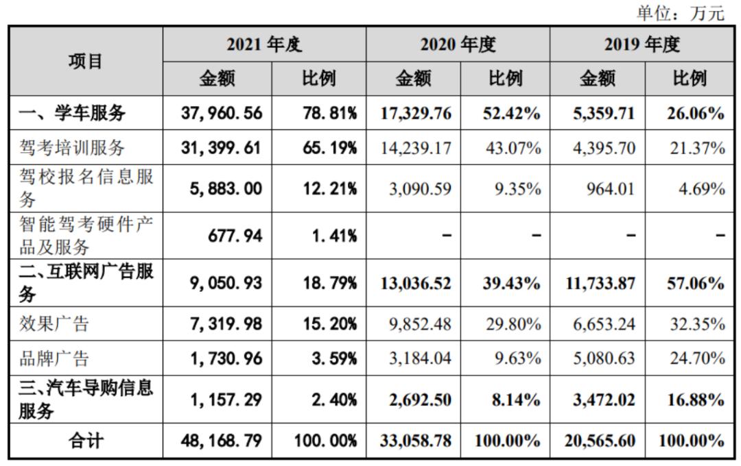 其中,学车服务收入达3.8亿元,占总收入的78.81%;互联网广告服务收入达9050.9万元,占总收入的18.79%;汽车导购信息服务收入达1157.3万元,占总收入的2.40%。