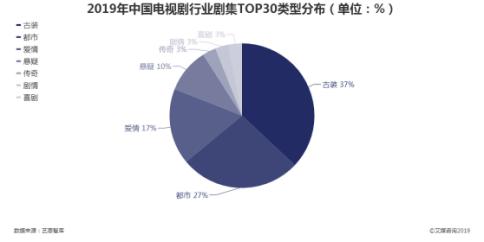 古装剧的热度自产出比例就可见一斑。即使在“限古令的影响下,”从2019年中国电视剧行业剧集TOP30类型分布来看,还是古装类型的聚集占比最高,为37%;其次是都市剧占比为27%;而喜剧、剧情和传奇类型的占比最低,且都为3%。