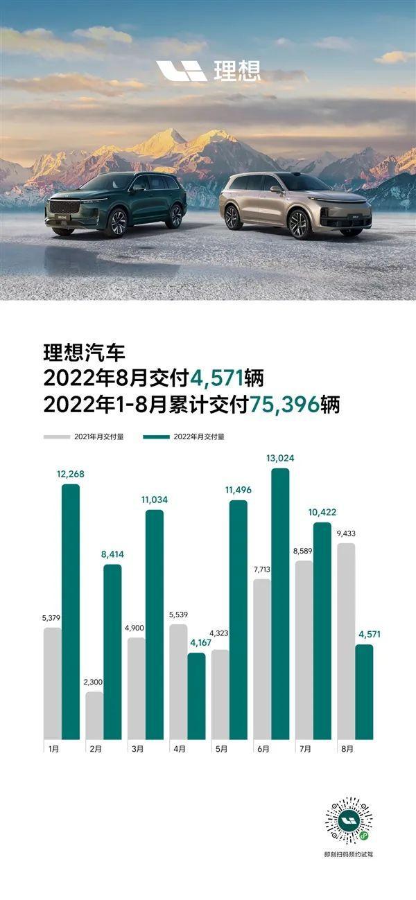 9月1日下午,理想汽车发布了8月份销量成绩,其一共交付了4571辆,包含理想ONE和理想L9。