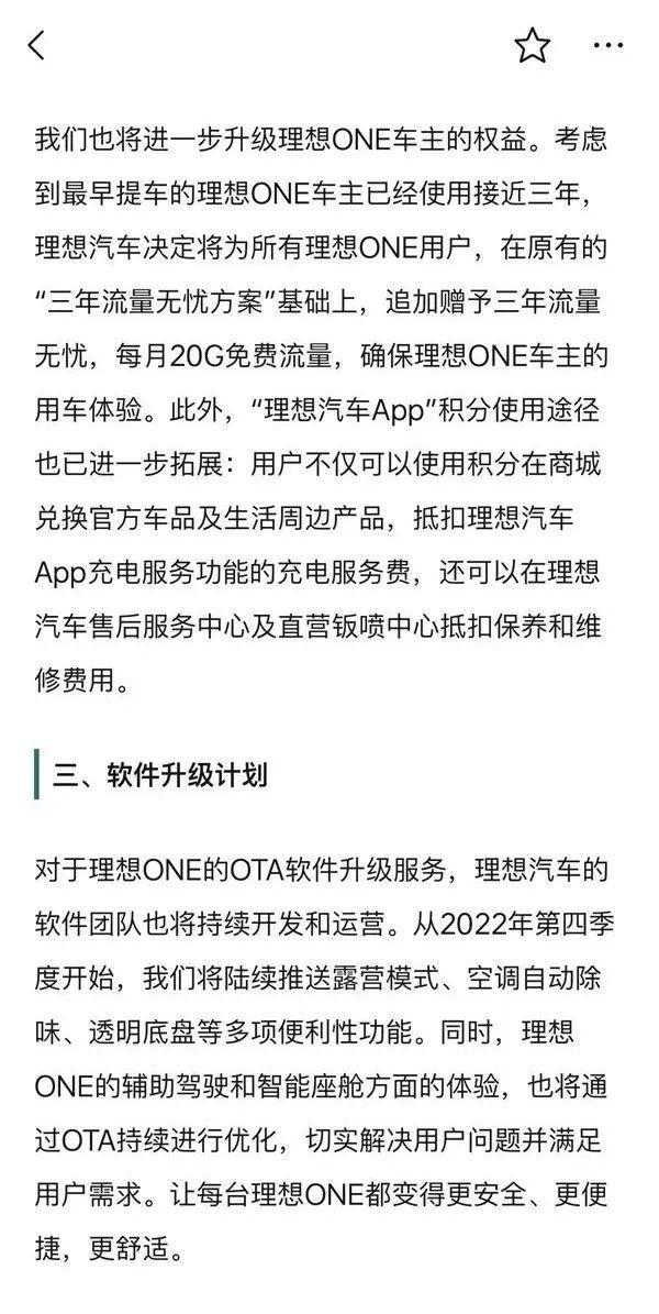 对此,理想也表示确有此事,还在官方App上发布了“情况说明”,表示停产后理想ONE的售后服务不会受到任何影响,甚至还多为老车主送上每月20G的免费流量。