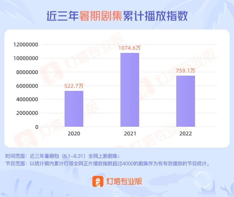 播放方面,2022暑期档全网剧集正片播放指数759.1万,同比去年(1074.6万)减少29.4%;部均正片播放指数10.25万,同比去年(10.5万)减少2.6%。