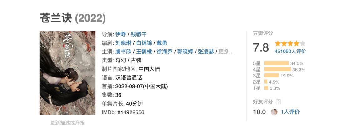 在站外,《苍兰诀》更是在全网收获了3000多个热搜,讨论度一骑绝尘,成为这个暑期档当之无愧的“剧王”。在豆瓣上,有45.1万网友给《苍兰诀》评分,进入今年豆瓣剧集评分人数的前5名。目前,《苍兰诀》维持着7.8分的高位水平,成为近年来罕有的高分玄幻剧。