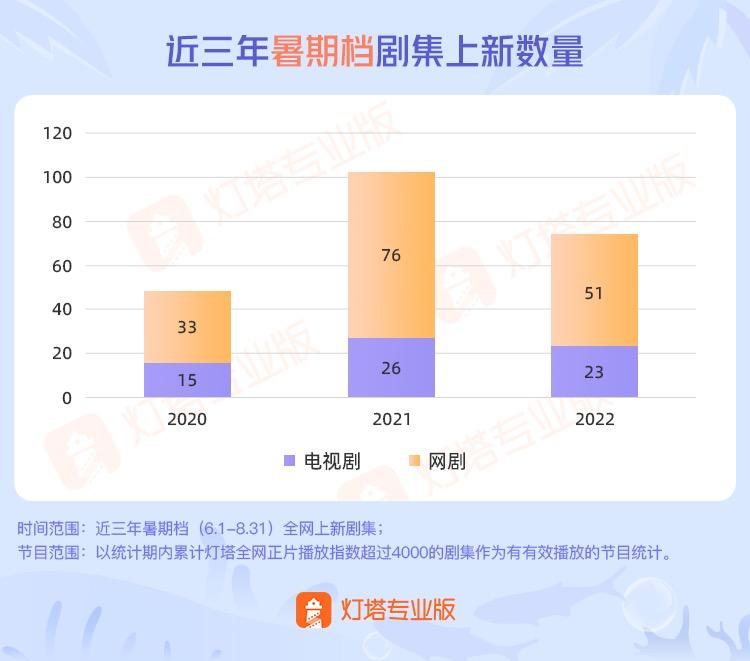 灯塔专业版联合酷云互动发布的统计数据显示,2022年暑期档期间新上线剧集74部,同比去年减少27.5%,其中电视剧23部,对比去年减少3部;网剧51部,对比去年减少25部。