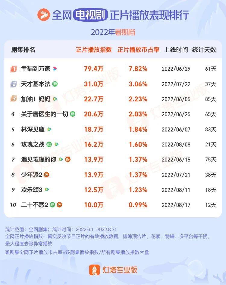 刚刚结束的2022年暑期档,多部剧集实力出圈,其中,《幸福到万家》以7.82%的正片播放市占率和11.28%的全端播放市占率高居暑期档剧集第一,实现了口碑热度双丰收。本来没有被寄予太大期望的《苍兰诀》则频繁出现在各大社交平台热搜榜和朋友圈之中,最终以4.82%的全端播放市占率位居暑期档第五,成为今年暑期档涌现出的一匹黑马。