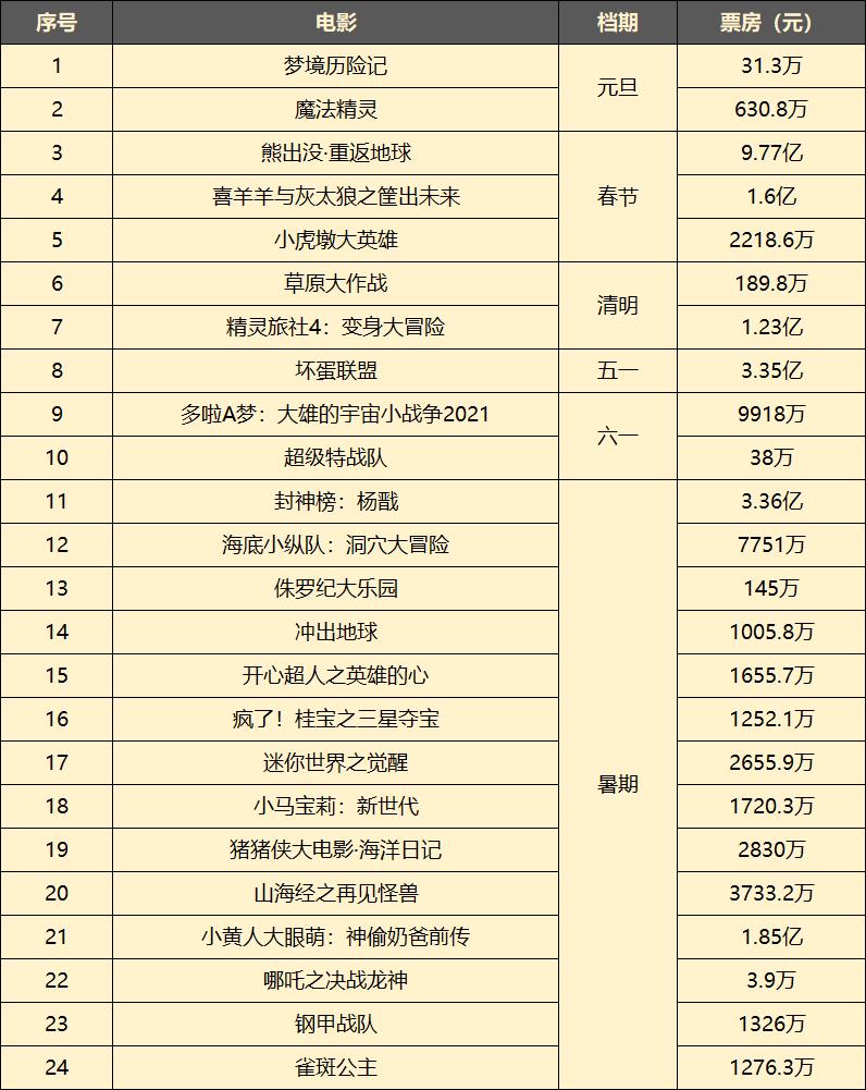 这两年间,国内票房过亿的动画电影有13部,过5亿的只有3部,过10亿的没有,国产的没有《哪吒》《姜子牙》,海外的没有《寻梦环游记》《你的名字。》。