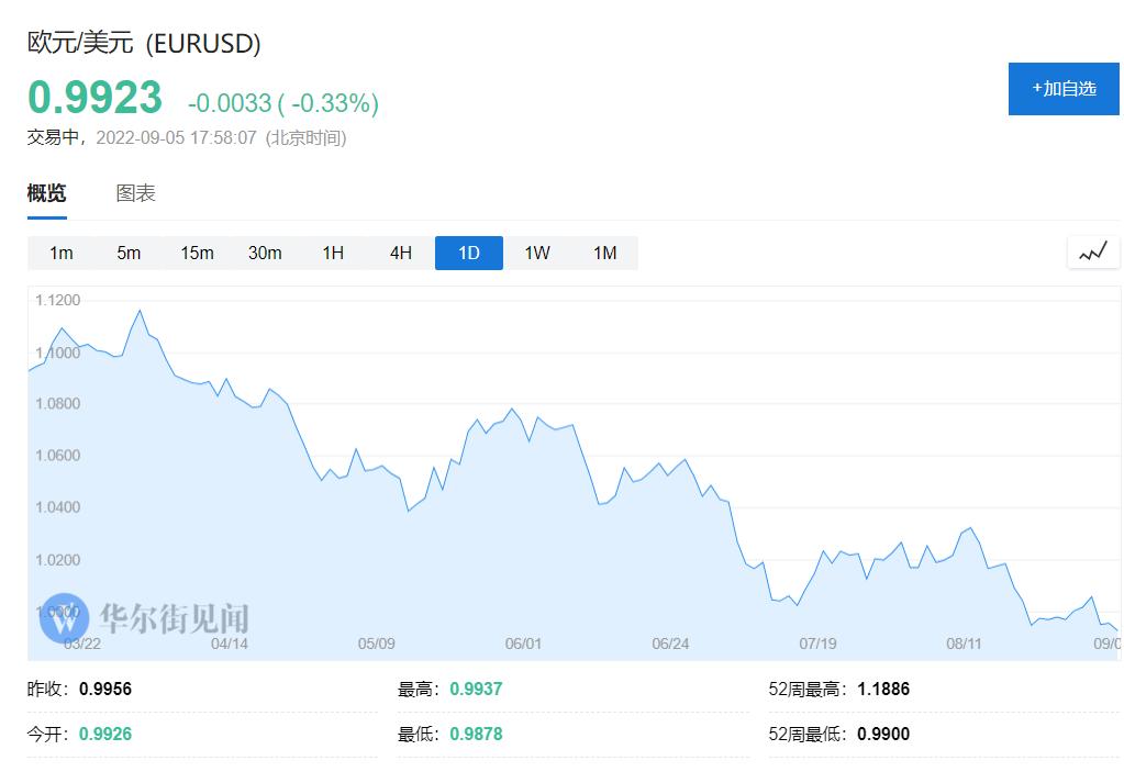 与此同时,欧洲国债的收益率也在集体上升:五年期英国国债大跳水,收益率上涨12.6基点至2.978%;英国十年期国债收益率自2014年初以来首次触及3%,日内上涨9个基点。欧元兑美元今日一度贬至0.9878,为20年来首次跌破0.99 美元;英镑兑美元也一度跌至1.14435,创下1985年来最低价位。