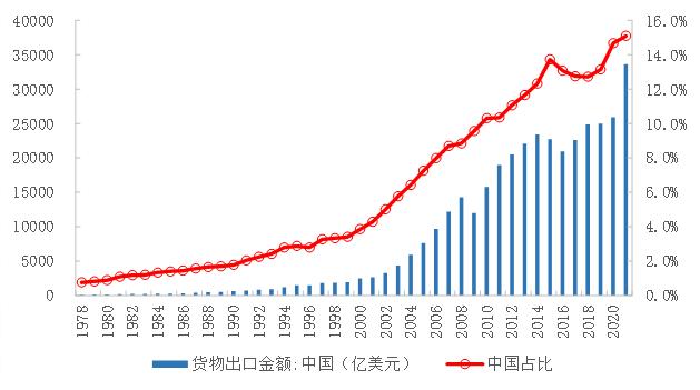 仅七年时间(2001-2008),中国出口份额赶超德国和美国,首居世界第一。而后便是持续高歌猛进,到2021年商品出口份额已升至15.1%,金额高达3.36万亿美元。