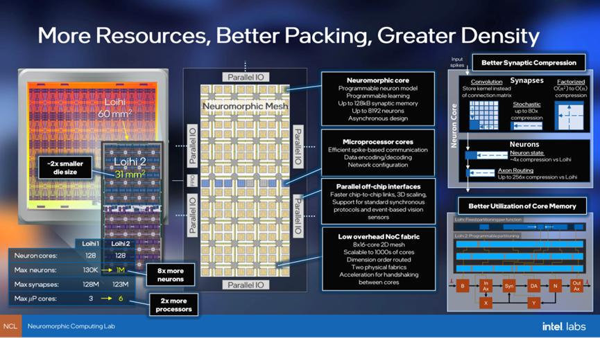 英特尔的Loihi是全数字设计的神经形态芯片。2017年,英特尔开发出第一款Loihi。2021年,英特尔在此基础上推出第二代Loihi2,采用Intel 4制程工艺生产,单芯片神经元数量达到100万。