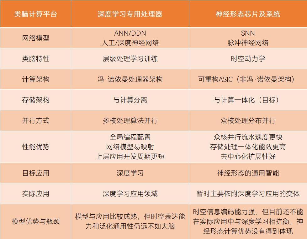 简单解释二者原理,深度学习专用处理器是降维处理,把多维问题转换为一维信息流;神经形态芯片是升维处理,通过多维时空变换,以期更接近人脑思考方式,从而获得更好的能耗、算力和效率。[6]