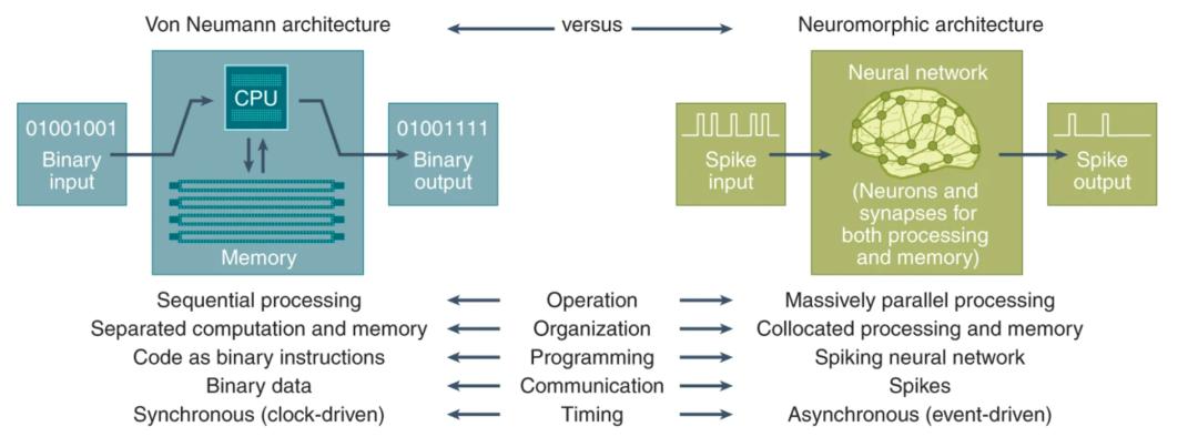 冯诺依曼架构与神经形态架构的对比,图源丨Nature Computational Science[7]