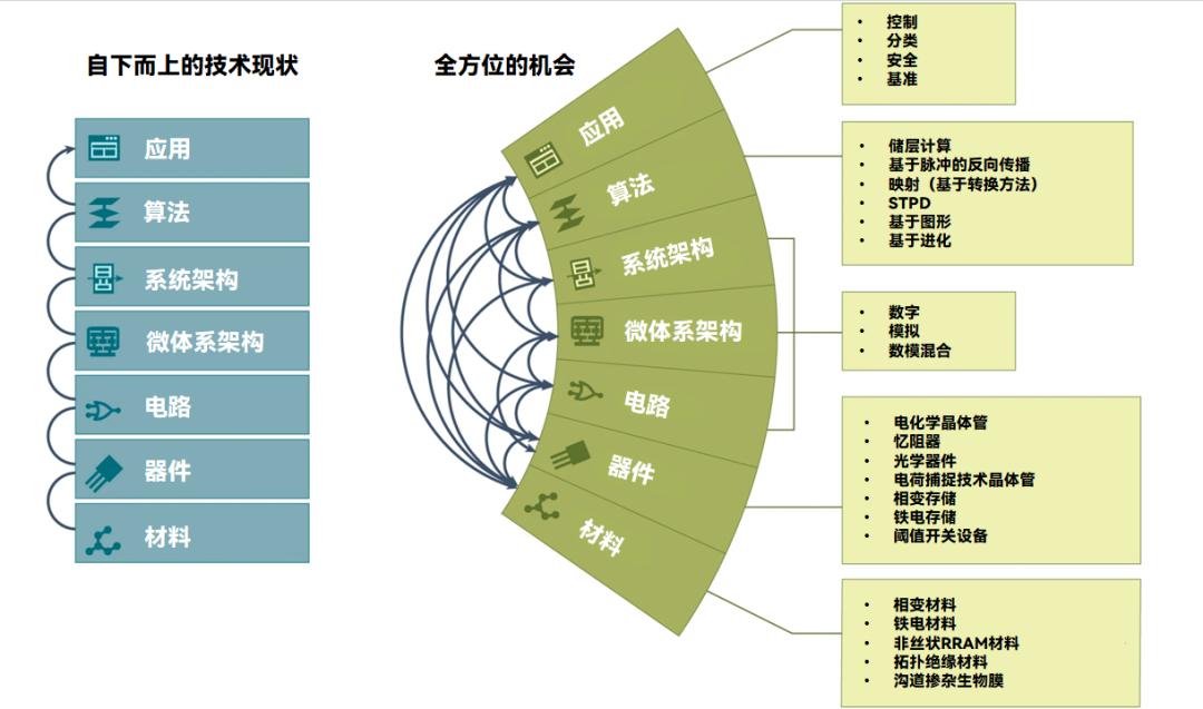 一颗理想的神经形态芯片背后是多个学科的碰撞,包括在材料上追求类生物物质,在器件上构造神经元与突触,在电路上实现神经网络连接,在算法上实现大脑思考能力[19]。不同神经形态芯片的涉及材料、器件、工艺极多,而它也将会自下而上地从材料、器件、电路、架构带动算法和应用。[7]