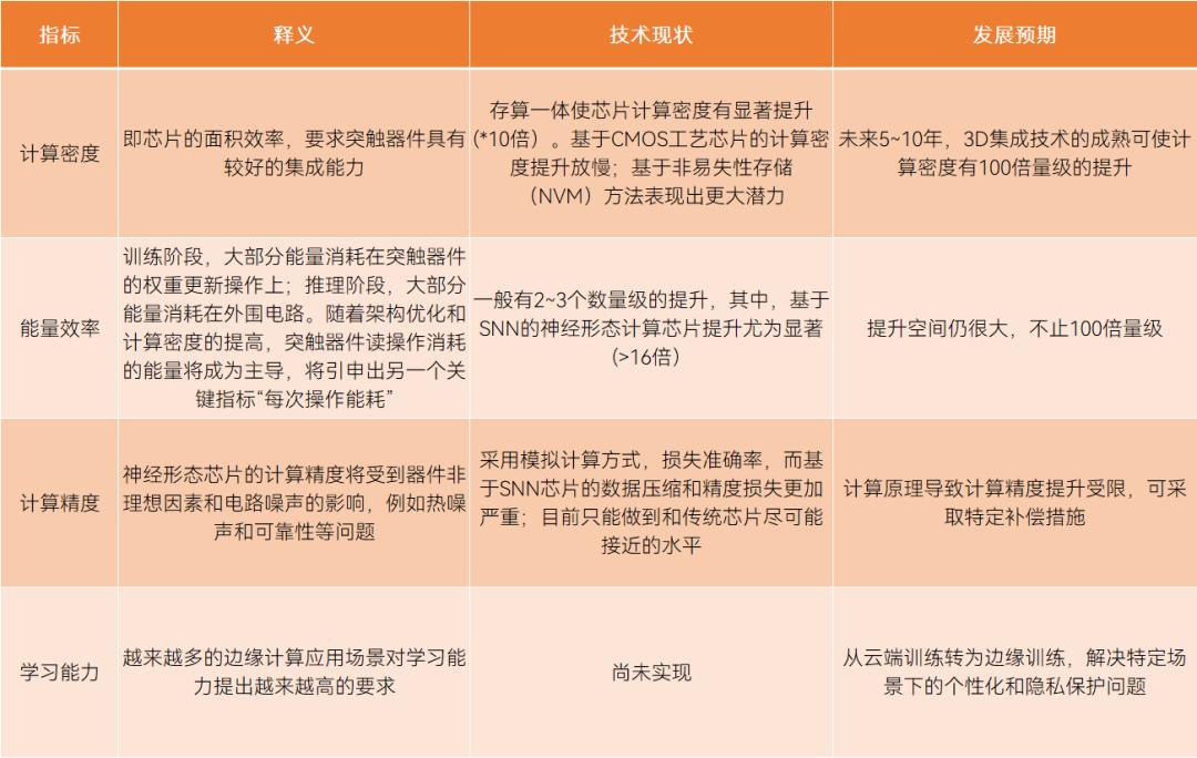 如何衡量一颗神经形态芯片的好坏?主要从计算密度、能量效率、计算精度和学习能力四项指标来评价其竞争力。[20]