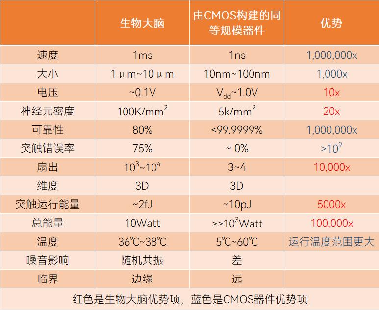 但也不是说人造的器件就没有任何优点,假如能用CMOS构造出与生物大脑同等规模的器件,二者会呈现不同的优势领域,神经形态芯片最终一定是结合生物大脑和人造器件各自优点而设计制造。