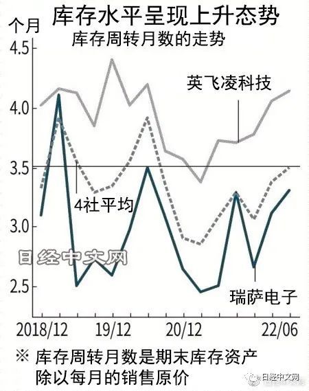 大型车载半导体企业的库存已恢复至新冠疫情前的水平。日本瑞萨电子等4家企业的2022年4~6月库存周转月数平均为3.48个月,与2019年年均(3.51个月)基本持平。始于2020年下半年的半导体供不应求正趋于改善,可能有助于整车企业等挽回生产。另一方面,对各半导体企业来说,库存成为业绩下行压力的风险也在浮出水面。