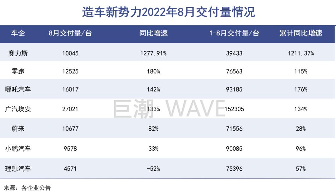 从8月份公布的销售数据来看,“蔚小理”全部跌出前三,华为加持的赛力斯马力全开,8月交付量首次突破万辆,同比暴增近13倍;
