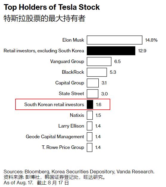 别以为这只是口嗨,新冠疫情期间,韩国散户买入了 150 亿美元特斯拉股票,成为了特斯拉第七大股东,排在他们前面的是美国道富银行。