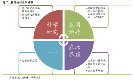 西南证券研报显示,基因编辑大致有三个大的应用方向:科学研究、基因治疗、农牧养殖,具体到农业领域,可以改良农作物形状,培育更加优质的农作物种子,提高农作物的抗蚊虫、抗药性等。