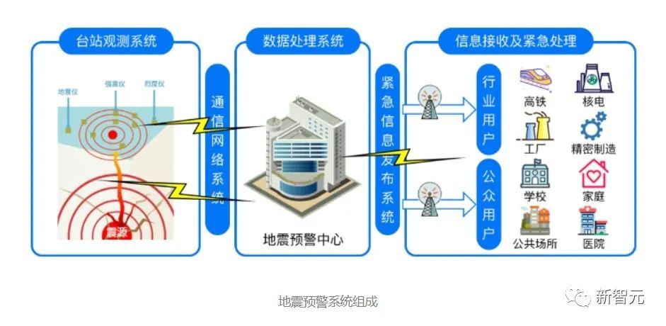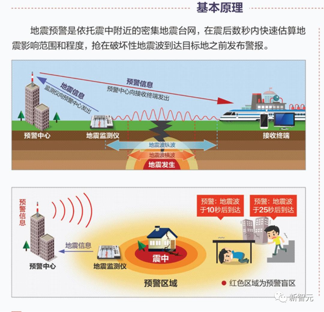 地震波分为纵波和横波,前者传播速度快、破坏力小,后者传播速度慢、破坏力大。地震预警的基本原理,就是利用两者的时间差发出警报。离震源较近的地震观测仪器接收到地震纵波后,实时并持续估计地震参数及其影响,并向地震横波尚未到达的可能受灾区域,提前数秒至几十秒发出警报信息。