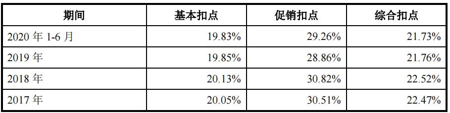 2017-2020年上半年嘉曼服饰联营店扣点情况