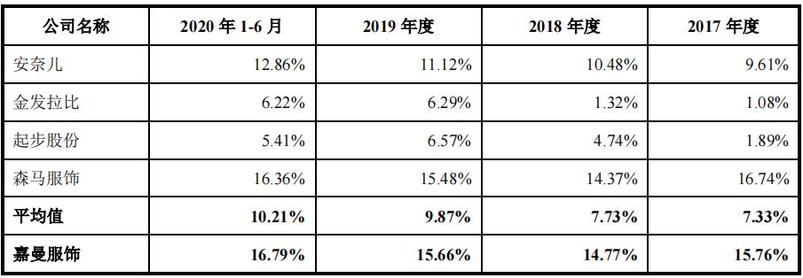 这或与嘉曼服饰研发投入不足有关。招股书披露,2015—2018年上半年,嘉曼服饰研发投入分别为273.36万元、373.55万元、487.75万元、288.88万元,占当期主营业务收入的比重分别为0.71%、0.93%、0.89%、0.88%。而森马服饰在2017年、2018年上半年的研发投入分别为3.53亿元、8848万元,研发费用率分别为2.94%、1.6%。嘉曼服饰研发投入占比较森马低了0.8—2个百分点。