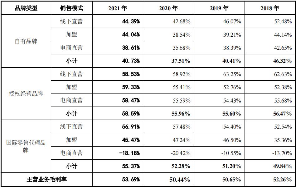 对于部分授权品牌和代理品牌,嘉曼服饰则直接向品牌方采购商品。由于不涉及生产环节,嘉曼服饰的运作模式较轻,在不占用大量资金的同时能够保证较高的毛利率。2019-2021年,嘉曼服饰主营业务毛利率分别高达50.65%、50.44%、53.69%。