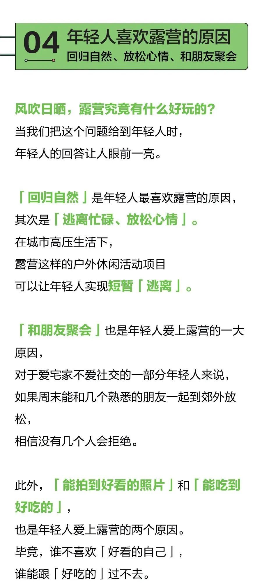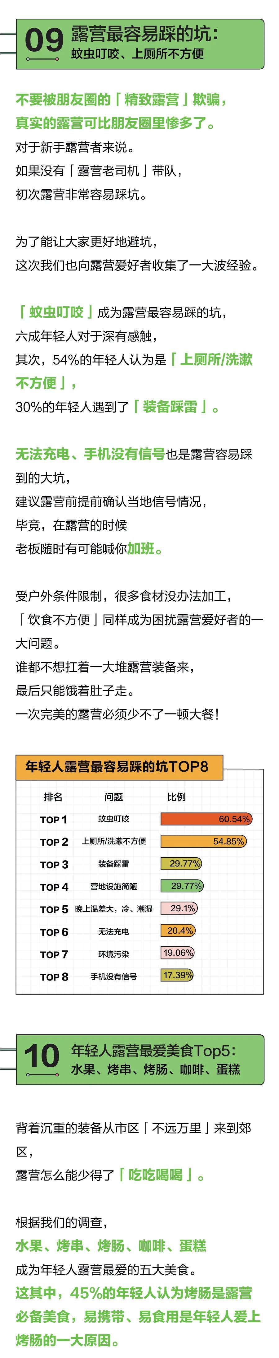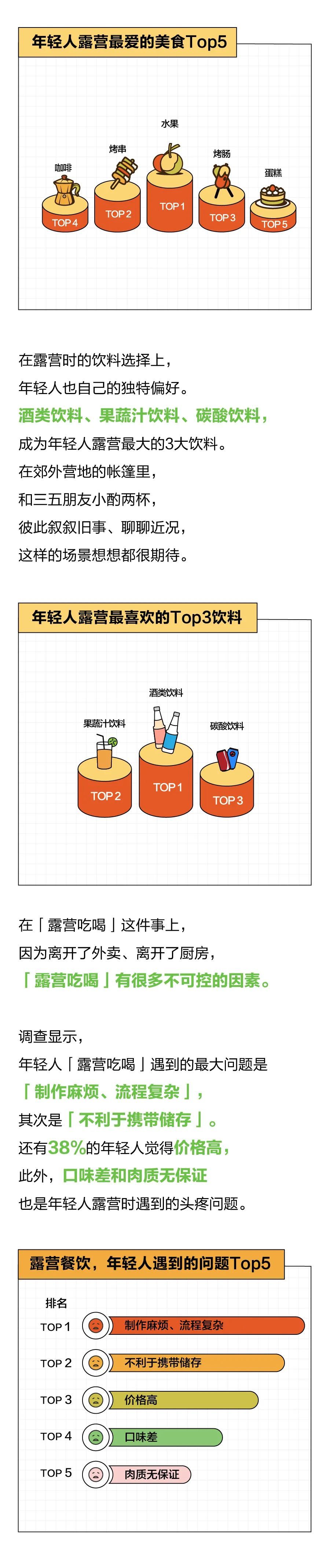 不管是旅行方式还是短暂逃离,重要的当然是要玩得开心。通过本次调查我们能看到,在露营这件事上,除了露营装备、营地卫生间等设施情况,年轻人更关心「露营能不能吃好」。制作流程简单、可快速使用、便于携带存储、性价高是年轻人对露营食材的基本要求。