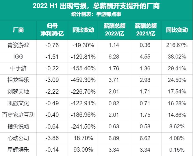 诸如青瓷游戏、祖龙娱乐、IGG等均有超过30%的薪酬涨幅。但这里也有2家公司有些特别,就是心动公司与星辉娱乐。这两家厂商仍处在亏损的状态,但因亏损数额收窄,薪酬开支也略有提升。