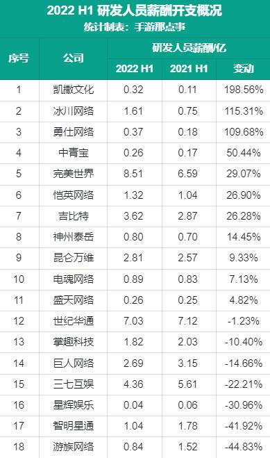 当然涨幅的变动情况与初期基数也有较大的关系,尽管凯撒文化、冰川文化、勇仕网络等厂商用于研发人员的薪酬开支提升夸张,但总数仍与头部厂商间有着较大的差距。