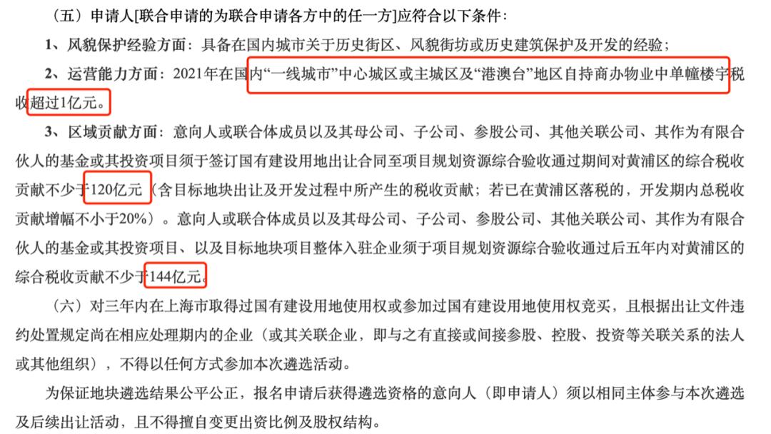 与此同时,该地块的条件还包括,拿地单位须于签订国有建设用地出让合同至项目规划资源综合验收通过期间,对黄浦区的综合税收贡献不少于120亿元。项目规划资源综合验收通过后,5年内对黄浦区的综合税收贡献不少于144亿元。