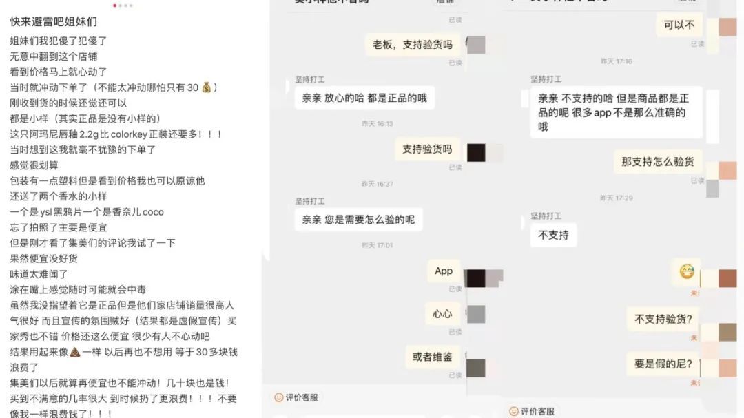 再次之后,陈影凡在购买前都要询问客服是否支持验货,但大部分客服都拒绝了。“这一下就让我清醒了,如果是正品的话为什么不敢验货。那很可能我之前买的很多小样都是假货。”陈影称。