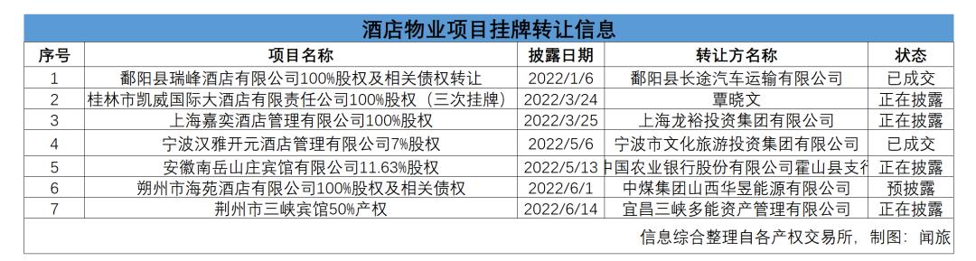 2021年有所恢复的酒店市场在2022上半年再次遭受疫情“倒春寒”,除业绩亏损外,上半年有关酒店管理公司的股权转让、资产出售一波又一波。闻旅梳理各产权平台公开披露的信息显示,截至6月30日今年上半年正式披露、预披露以及完成交易的酒店管理公司股权挂牌转让交易有7起。