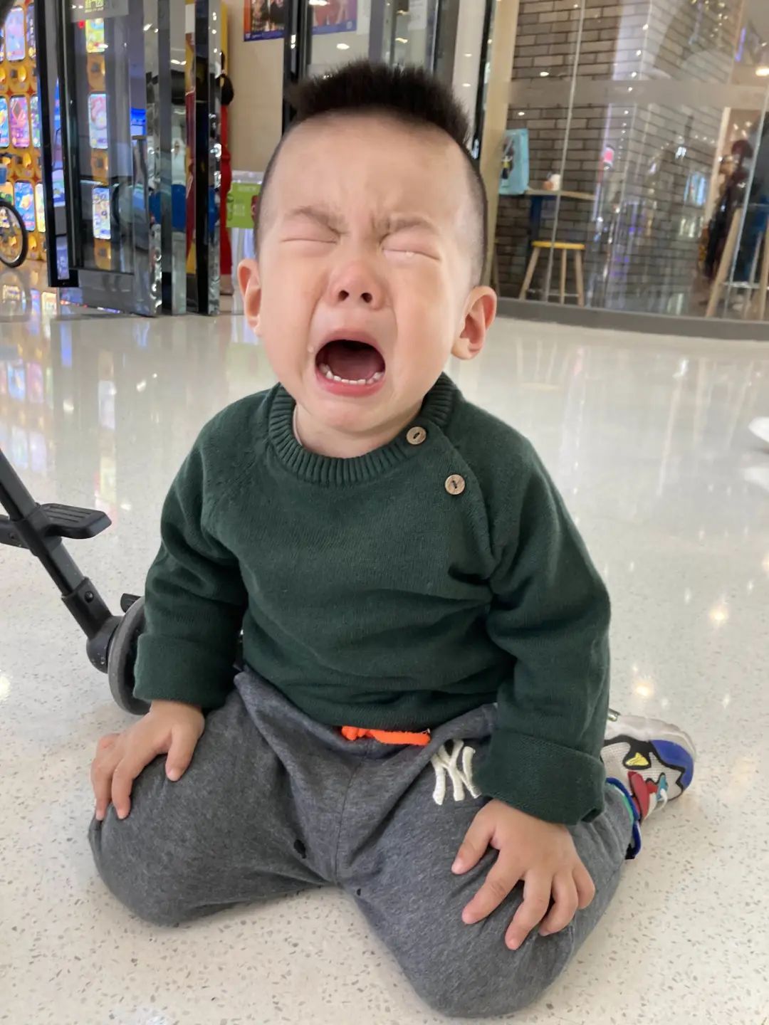 公共场合,孩子想买玩具或零食,躺在地上发脾气,90后父母在一旁“冷眼旁观”,拍照留念。