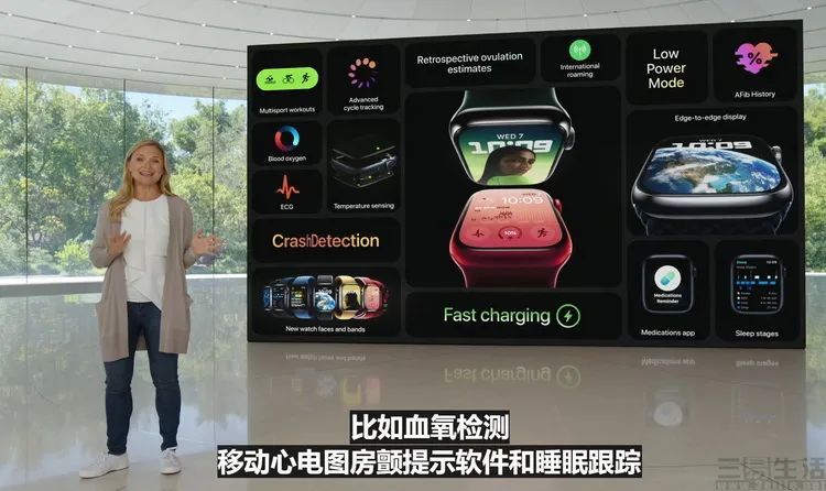 相比之下,苹果在发布会上的策略则没有那么极端。比如说,在此次介绍Apple Watch Series 8新增的传感器配置时,他们并没有枯燥地纯讲技术,而是将其与新的经期追踪、车祸检测等功能结合起来,通过生动的“真人演示”,让人一下子就既能记住新款智能手表增加了多个新的硬件配置,又可以直观地了解它们能带来哪些好处。