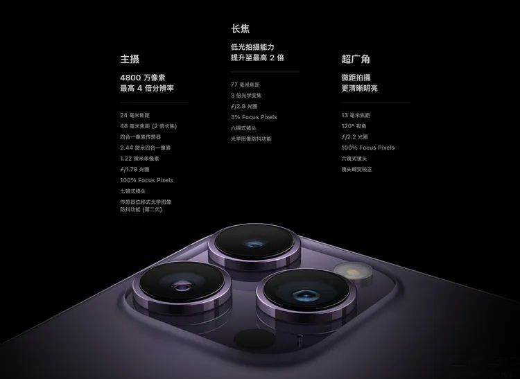 此外我们还注意到,在介绍iPhone 14 Pro与iPhone 14 Pro Max全新的4800万像素主摄方案时,苹果方面非常明确地给出了大量的技术细节。比如1.22微米的单像素尺寸,实际上也就等于告诉了大家,其CMOS尺寸应该在1/1.28英寸到1/1.33英寸之间,是目前行业中“底最大”的4800万像素方案。