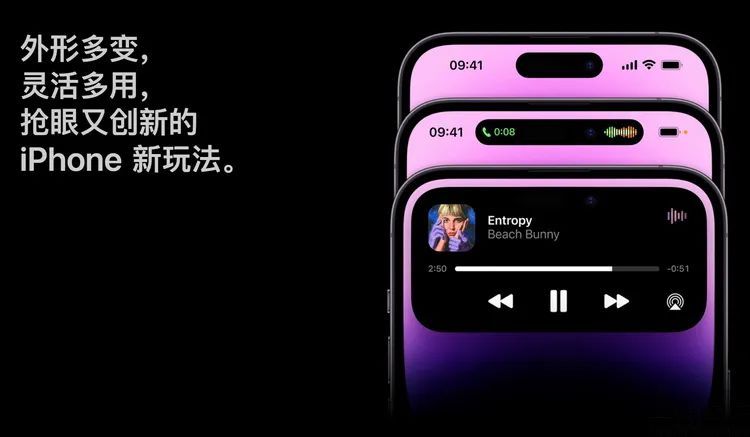 又比如说,此次iPhone 14 Pro与iPhone 14 Pro Max采用了新的前摄和FaceID传感器造型。考虑到目前行业的技术水平还无法做到“屏下结构光”,并且对于重视3D人脸识别的设备来说,挤占屏幕显示面积确实是无法避免的设计。然而相比起简单粗暴的异型全面屏或此前传言的开孔屏,最终我们看到的,是融合了通知信息,并且会自动缩放大小的“Dynamic Island(灵动岛)”,显然这是一种更优雅、且富有创意的设计。
