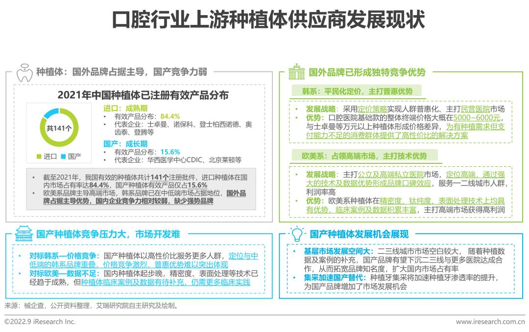 口腔行业上游主要为耗材及器械厂商,主要分为低值耗材、高值耗材及设备。低值耗材产品种类多且杂,多数市场空间较有限,竞争格局较差;高值耗材集中在种植和正畸两大领域。种植领域中,种植体是核心耗材,占据较大的价值量,但目前我国种植体市场中,欧美及韩系等进口品牌占据主导优势,国内种植体企业竞争压力大,市场开发困难。欧美系主打技术壁垒,在材料、表面处理技术及精密设计上形成优势,占领公立医院等高端市场;韩系主打价格优势,已在民营医院市场形成客户粘性;国产品牌市场发展空间小,国产替代需要时间及新的发展机会。