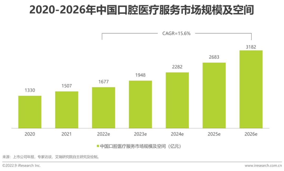 艾瑞研究发现,以终端消费额计, 2021年中国口腔医疗服务市场规模约为1507亿元,在国民爱牙意识增强、口腔诊疗需求扩大、国民收入快速增长、民营口腔医疗机构持续发力等因素的驱动下,预计未来口腔医疗服务市场将持续快速扩张,有望于2026年突破3千亿元,达到约3182亿元。预计2022年到2026年的复合增长率达15.6%,口腔行业未来市场前景广阔。