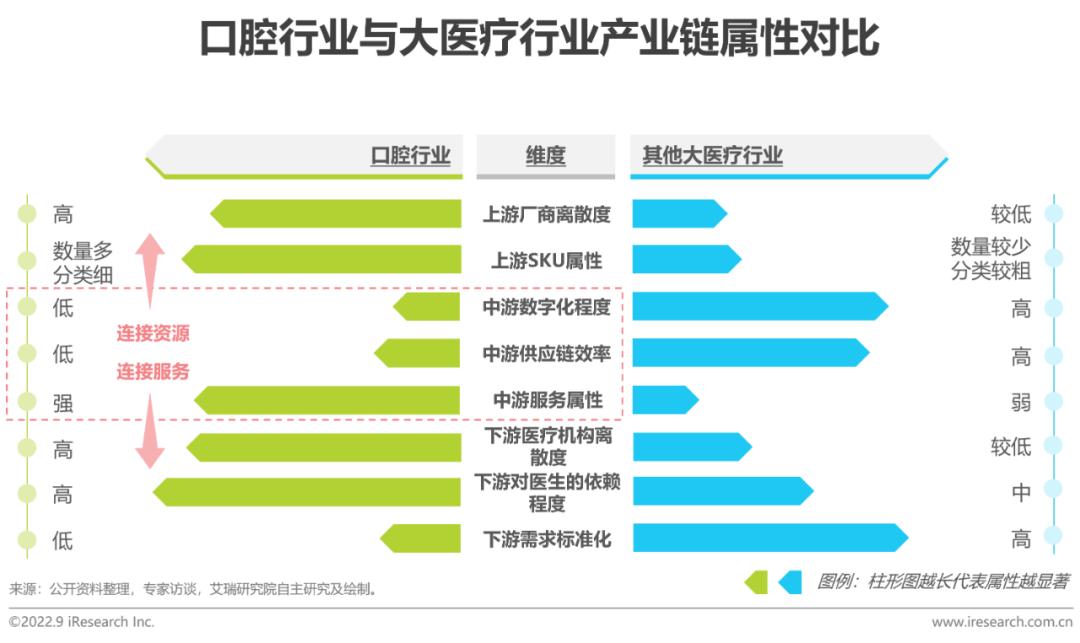 我国口腔上游厂商数量多、强势品牌少,且上游产品具有数量多(十几万常用SKU)、分类细、产品杂等特点,口腔上游离散程度高;同时,我国口腔下游十几万口腔诊所林立,口腔诊所具有规模小、离散程度高的特点,且任何产品和服务都离不开牙医的手工操作,对医生的依赖度明显高于其他医疗行业;牙医对耗材的需求也不同于眼科、骨科等其他科室,标准化程度较低。源于口腔行业上下游的分散性,口腔行业中游渠道商不同于其他医疗行业,需要在连接上游厂商整合资源的同时为下游诊所及医生提供服务,帮助医生选择产品并提供必要的手术跟台服务,具有很强的服务属性。
