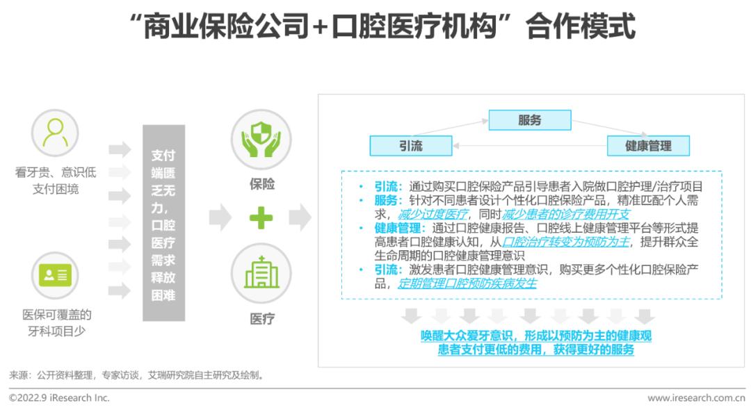 牙科多数项目不在医保范围内,“看牙贵”一直是消费者面临的重要阻碍,故支付成为口腔行业面临的重要问题。支付端困境难破,口腔医疗需求难以释放,只有从保险入手,补位国家医保,做到支付先行,才能更好的落实健康口腔行动。为提高群众的口腔健康意识,降低支付费用,获得更好的医疗服务体验,“商业保险+医疗服务”模式随之出现。保险公司与医疗机构从引流、服务、健康管理三个方面,整合支付与服务体系,打造商业保险与口腔医疗相结合的闭环。未来,医险融合的趋势将进一步发展,口腔商保和医疗服务如何更好契合将成为行业持续探索的问题。