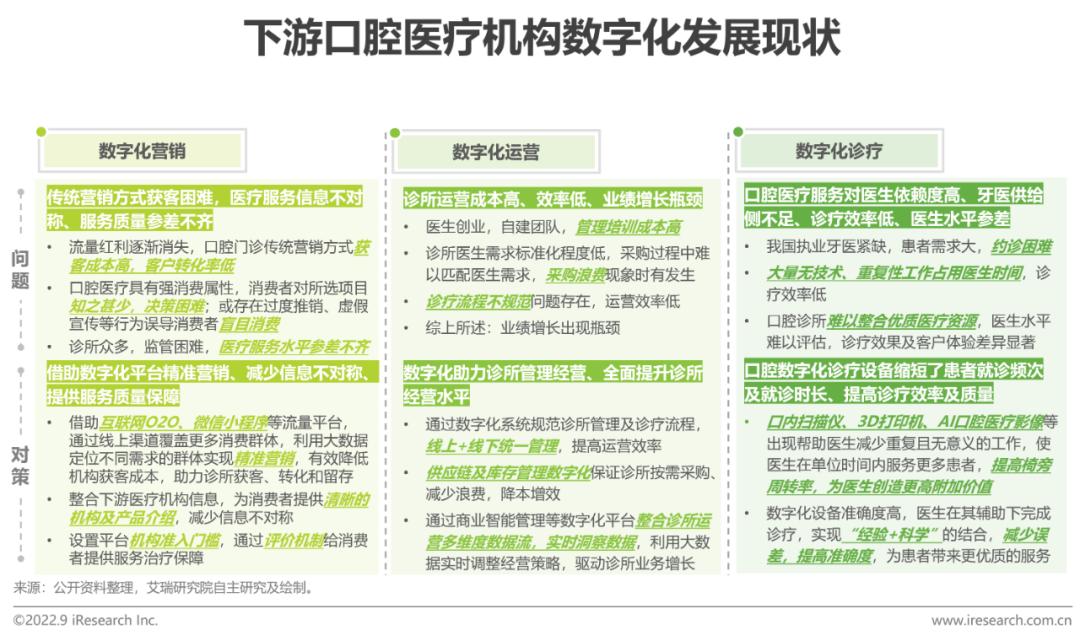 目前口腔下游医疗机构主要面临三个方面的问题:1)流量红利逐渐消失,营销获客成本高,客户转化率低,且下游诊所众多,监管困难,消费者体验参差不齐;2)诊疗流程不规范、管理困难等问题导致诊所运营效率低,业绩增长出现瓶颈;3)牙医供给侧不足导致诊疗效率低。数字化流量平台的出现一定程度上降低了口腔医疗机构营销获客的成本、通过大数据实现精准引流;提高诊所管理效率,利用大数据实时调整经营策略,驱动诊所业务增长;数字化诊疗设备的出现帮助医生减少重复无意义的工作,实现“经验+科学”的结合,有效减少了时间成本,提高了诊疗效率及质量。