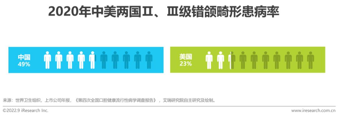 根据世界卫生组织,口腔三大疾病为错颌畸形、龋病、牙周病。错颌畸形不仅会影响“颜值”,严重的错颌也会对颌面部发育、口腔健康、口腔功能、心理信心造成一定程度的影响。我国《第四次全国口腔健康流行病学调查报告》显示,中国错颌畸形的患病率达74%,对应潜在错颌畸形患病人数约10.4亿人,美国错颌畸形患病率在73%左右;而诊疗难度更大的 II、III 级错颌患病率在中国高达49%,而美国仅23%。我国的主力正畸人群年龄范围集中在6-40岁,患病人数远超美国,并出现向两端扩大的态势,中国正畸市场患者基数庞大,市场需求强劲。我国2021年的正畸市场规模约为412亿元,预计到2025年将达到660亿元,2022-2025年增速为14%,成为新一轮高速增长的蓝海市场。