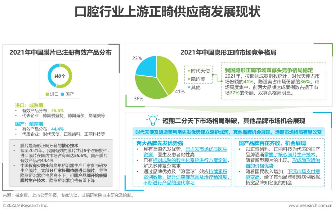 相比于传统的金属或陶瓷托槽,隐形正畸直击美观、卫生、舒适等痛点,近年来市场规模迅速增长,上升空间大。隐形正畸牙套的核心材料是膜片,目前我国有代表性的企业已开始掌握膜片研发技术,依赖进口膜片的局面开始打破,隐形正畸价格有望降低。就我国隐形正畸市场整体来看,以时代天使及隐适美为代表的双寡头市场竞争格局稳定,占据了77%的市场份额。由于两大品牌先发优势强,已占领市场优质资源并形成口碑效应,建立起深护城河,短期内其他玩家难以破局;但长期来看,随着膜片技术的掌握及口碑效应的增加,双寡头市场格局将被改变。