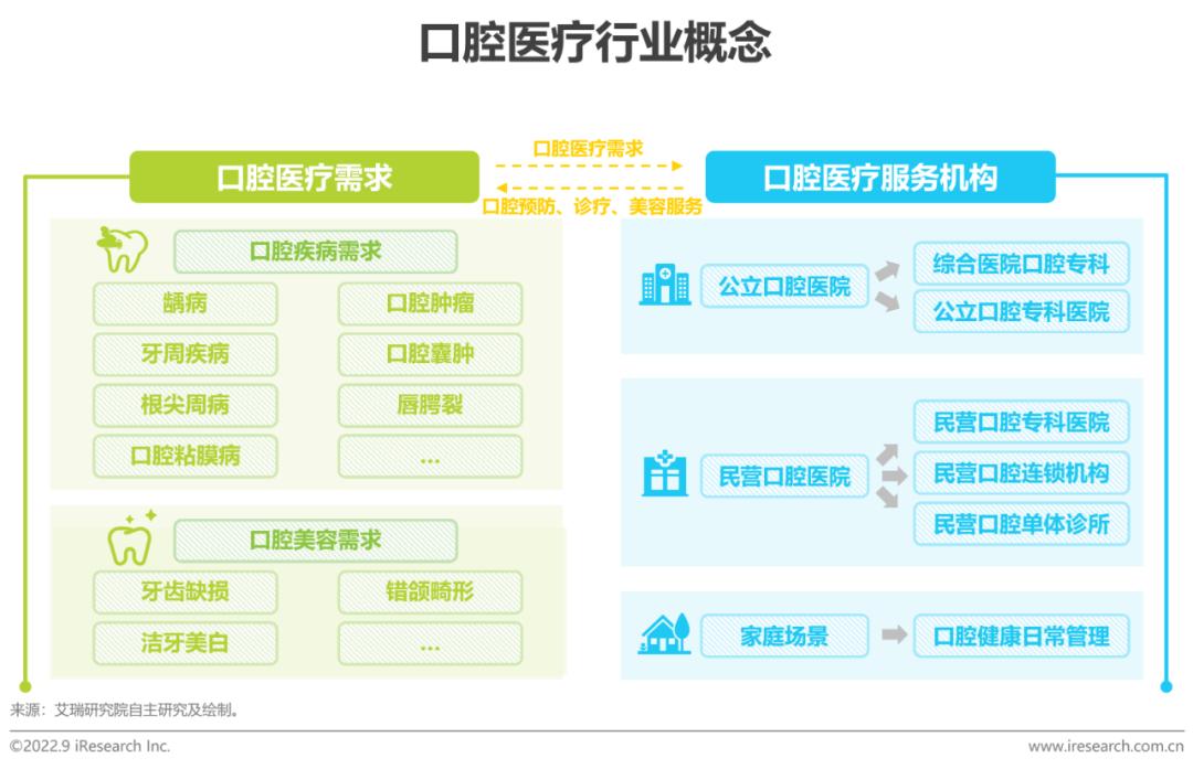 行业概况:口腔医疗是以口腔医疗服务消费为基础,包含医疗及消费双重属性,是为满足口腔及颌面部疾病的预防和诊疗、口腔美容等需求提供相关医疗服务的行业。目前我国口腔医疗行业进入蓬勃时代,需求端、供给端、政策端和资本端共同发力,进一步推动口腔行业的快速发展。但目前我国口腔行业仍面临居民口腔健康意识不足、口腔医生短缺、口腔医疗资源分配不均、诊所经营问题频发等痛点。