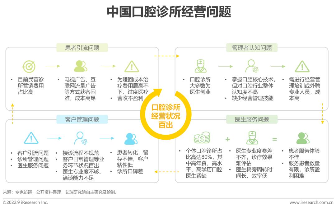 开设口腔诊所投入低,国家降低批照难度降低以及鼓励社会办医等因素,共同促使口腔诊所成为口腔医疗市场的主体。目前我国的口腔诊所大多由医生创业开设,在经营管理方面容易面临以下四个问题:1)患者引流困难,诊所营销获客成本高;2)管理者认知不足,对口腔行业整体发展及经营管理等知识认知度不高;3)医生专业度参差不齐,诊疗人数有限,患者服务体验不佳;4)前面三大环节出现问题会导致客户转化率低、留存不佳、诊所口碑差,从而进入引流困难的循环。