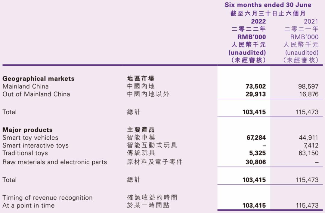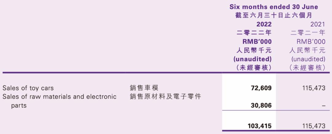 奇士达主要从事车模制造及销售。上半年,其来自“销售车模”的收入为7260.9万元(智能车模收入6728.4万元,传统玩具收入532.5万元),同比减少37.12%;销售原材料及电子零件带来收入3080.6万元。